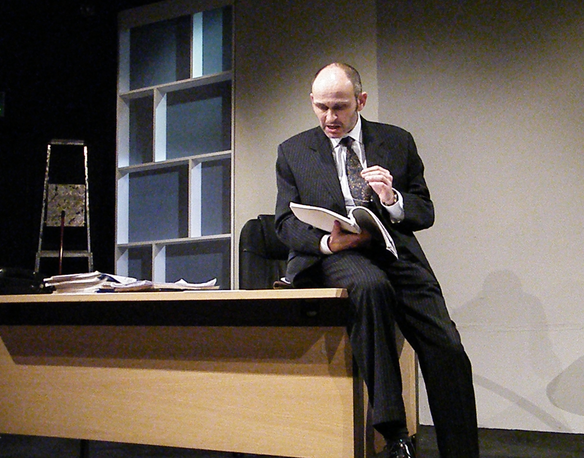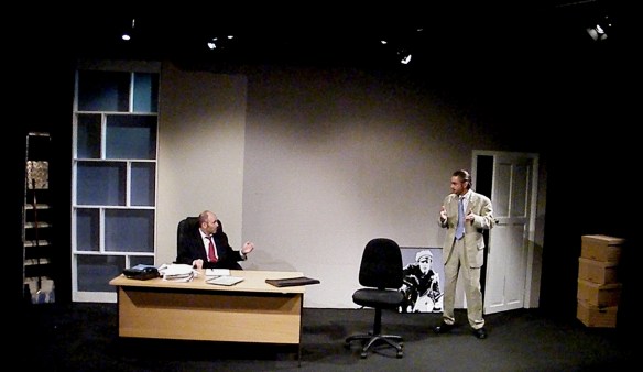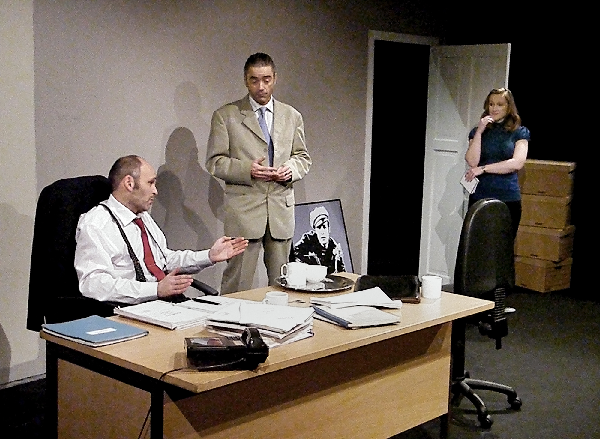 One of the scene changes had to be done in view of the audience. The script states that the producer had just been appointed, and his office was being redecorated. So we left a patch of wall painted a different colour, for the shelf unit when it was turned, and the stage crew wore white painters’ overalls as we did the transformation.