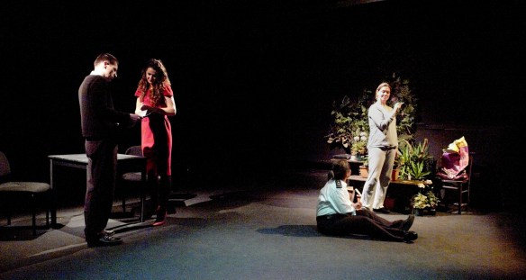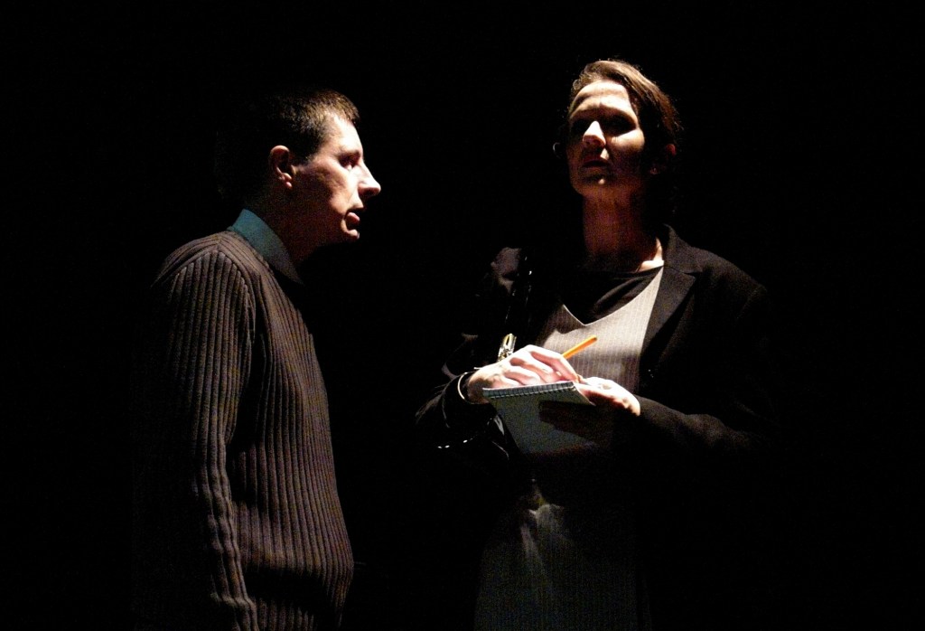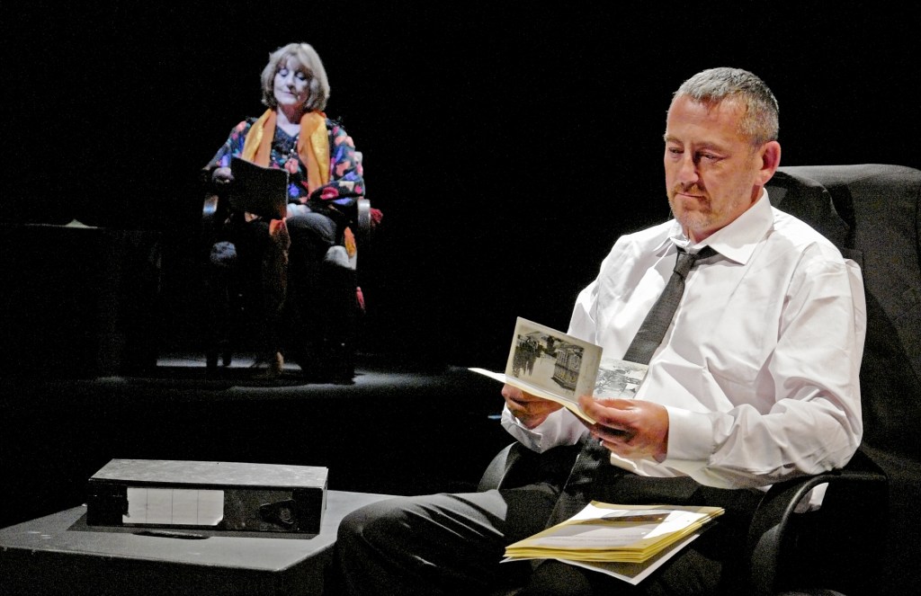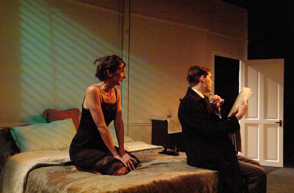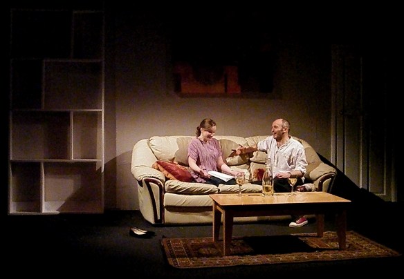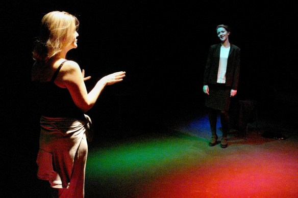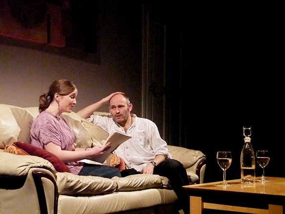 When I came to direct the piece in October, it struck me that the usual conception is false. Melissa is dead – so how can she be reading out her letters? I decided to stage it as though Andrew had just returned from Melissa’s funeral (note his black tie) and he’s re-reading his file of their correspondence. As he read his letters, Nik (the actor) managed to convey that note of regret and longing over the choices he’d made decades ago. Then the bluish light came up on Melissa, who’d been shrouded in darkness behind him, and she read her letters as though in the present, so Andrew hears them in his head exactly as she’d written them, before the illumination faded away again. The effect was of Melissa as Andrew’s memory, or perhaps a ghost . . .