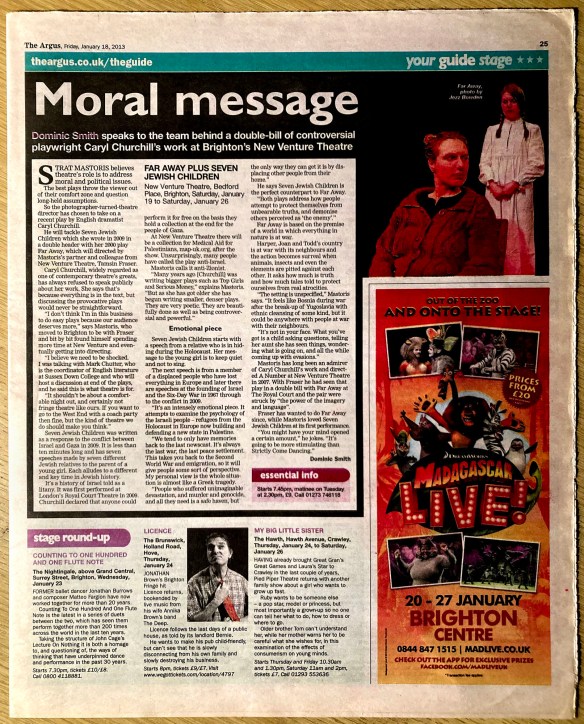 It’s a strange piece, set in a very dystopian future and open to a variety of interpretations, and Tamsin achieved a real feeling of unsettling menace from her cast. (you can read my personal assessment ‘Far Away’ in the ‘Analyses’ page of my theatre writing at http://www.stratmastoris.wordpress.com).
