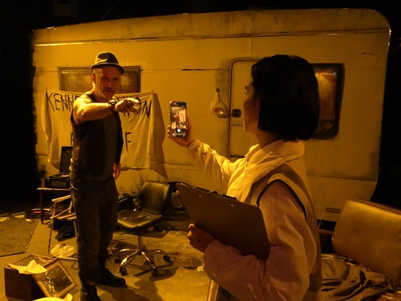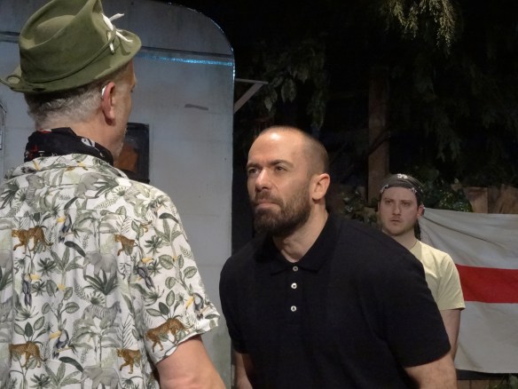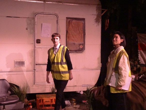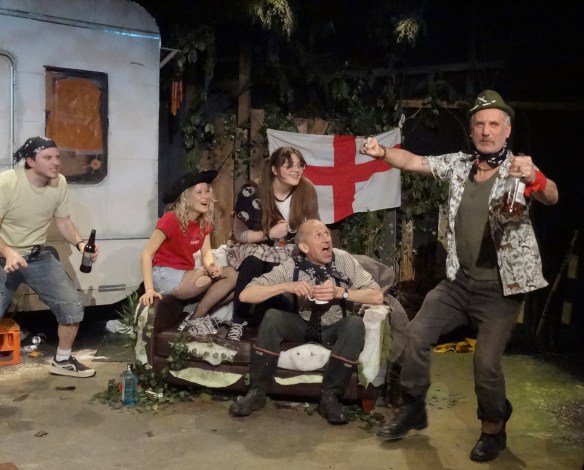 This is Phaedra, a fifteen year old girl from the West Country, who opens the Jezz Butterworth play that was New Venture’s February production. She’s singing the hymn based on William Blake’s great poem, and the play’s a celebration of ‘Englishness’ – for better or worse. Phaedra’s dressed as some kind of fairy or woodland sprite, and in fact the whole play is set in a wood, somewhere just outside a small Wiltshire town, where Rooster Byron lives in a broken-down caravan.