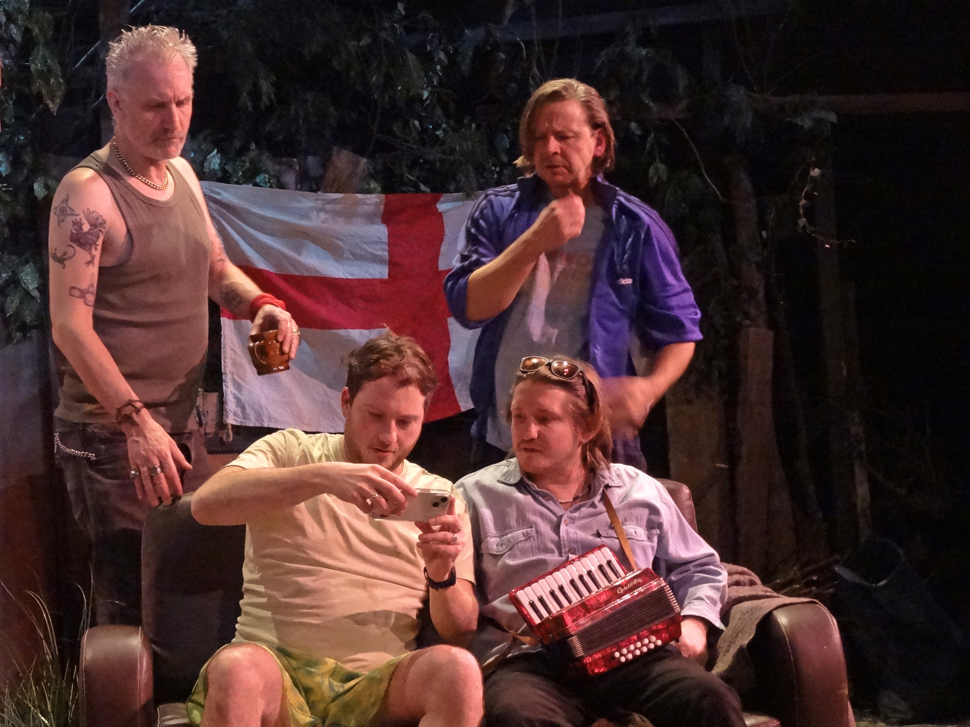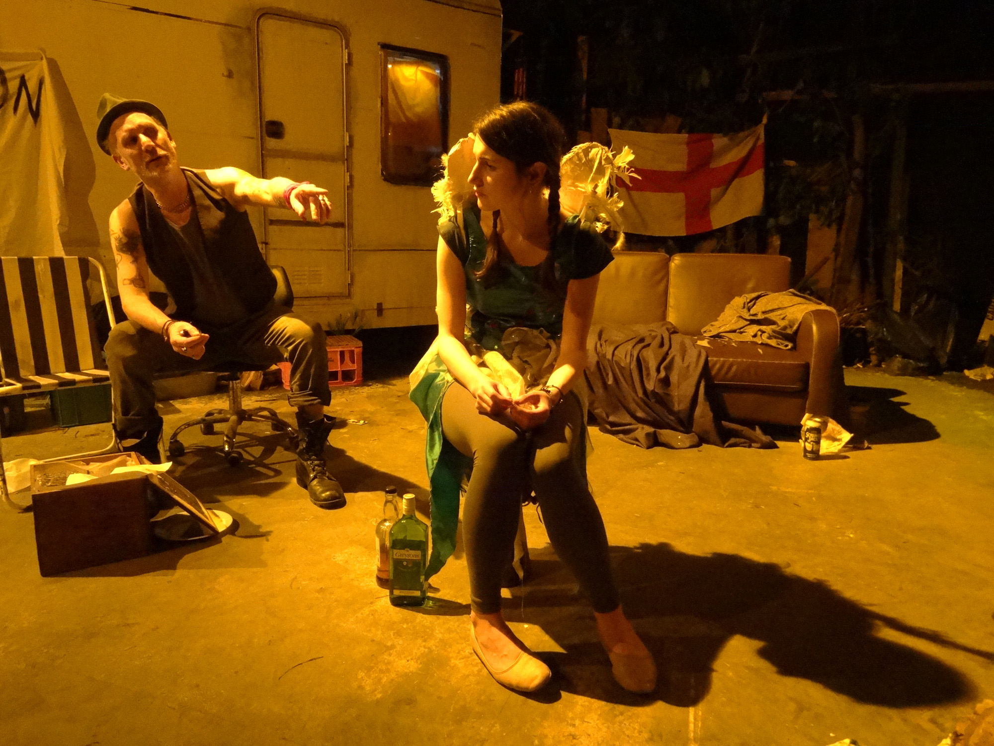 This is Phaedra, a fifteen year old girl from the West Country, who opens the Jezz Butterworth play that was New Venture’s February production. She’s singing the hymn based on William Blake’s great poem, and the play’s a celebration of ‘Englishness’ – for better or worse. Phaedra’s dressed as some kind of fairy or woodland sprite, and in fact the whole play is set in a wood, somewhere just outside a small Wiltshire town, where Rooster Byron lives in a broken-down caravan.
