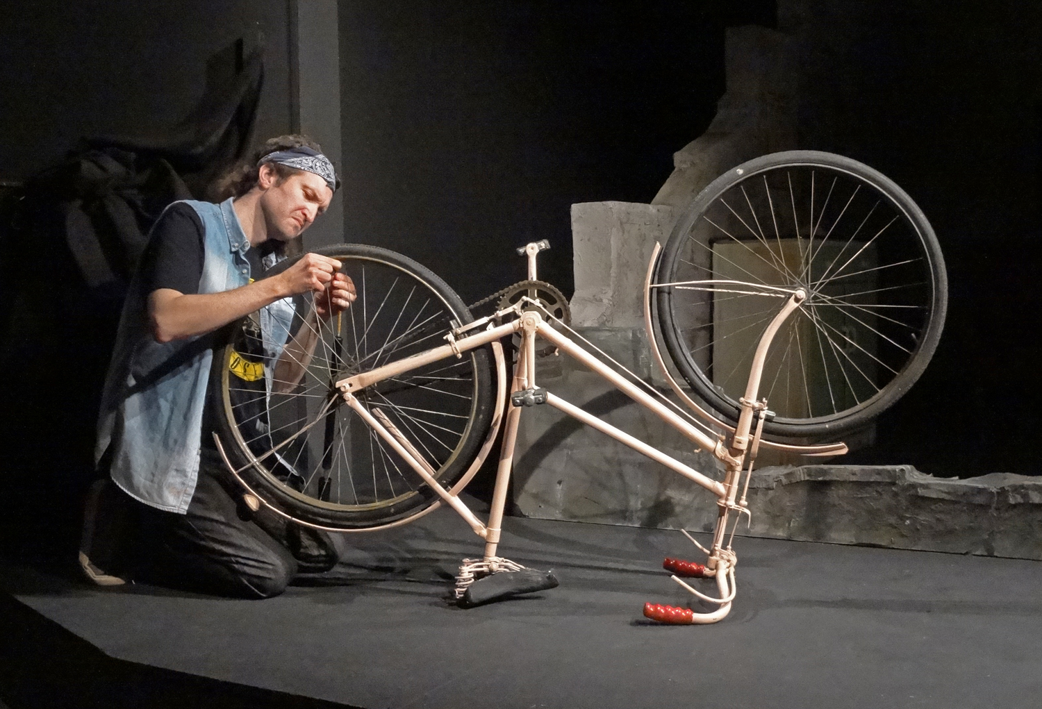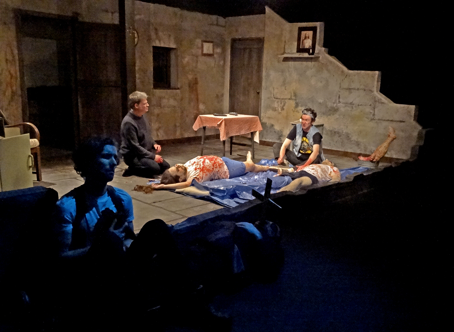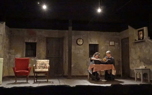 We used the entire stage for the first two plays, with the black-painted sides and back acting as a domestic setting that the audience had to visualise for themselves …