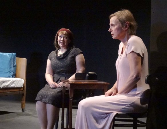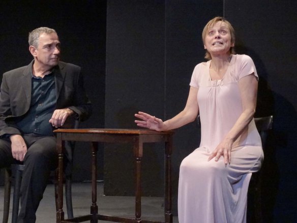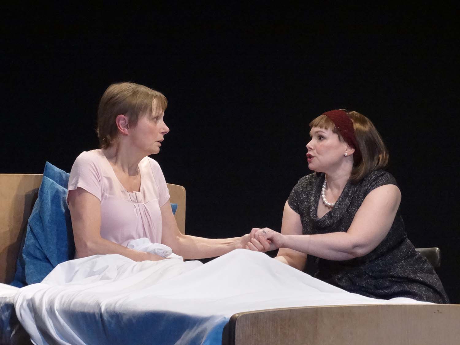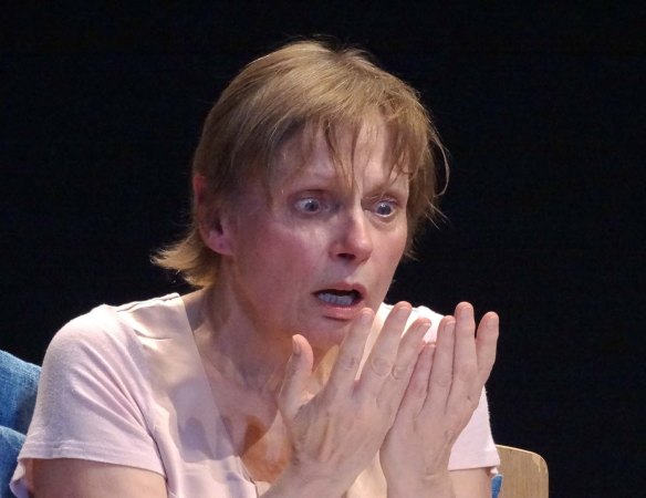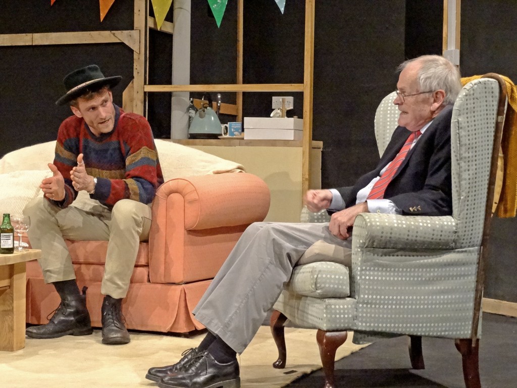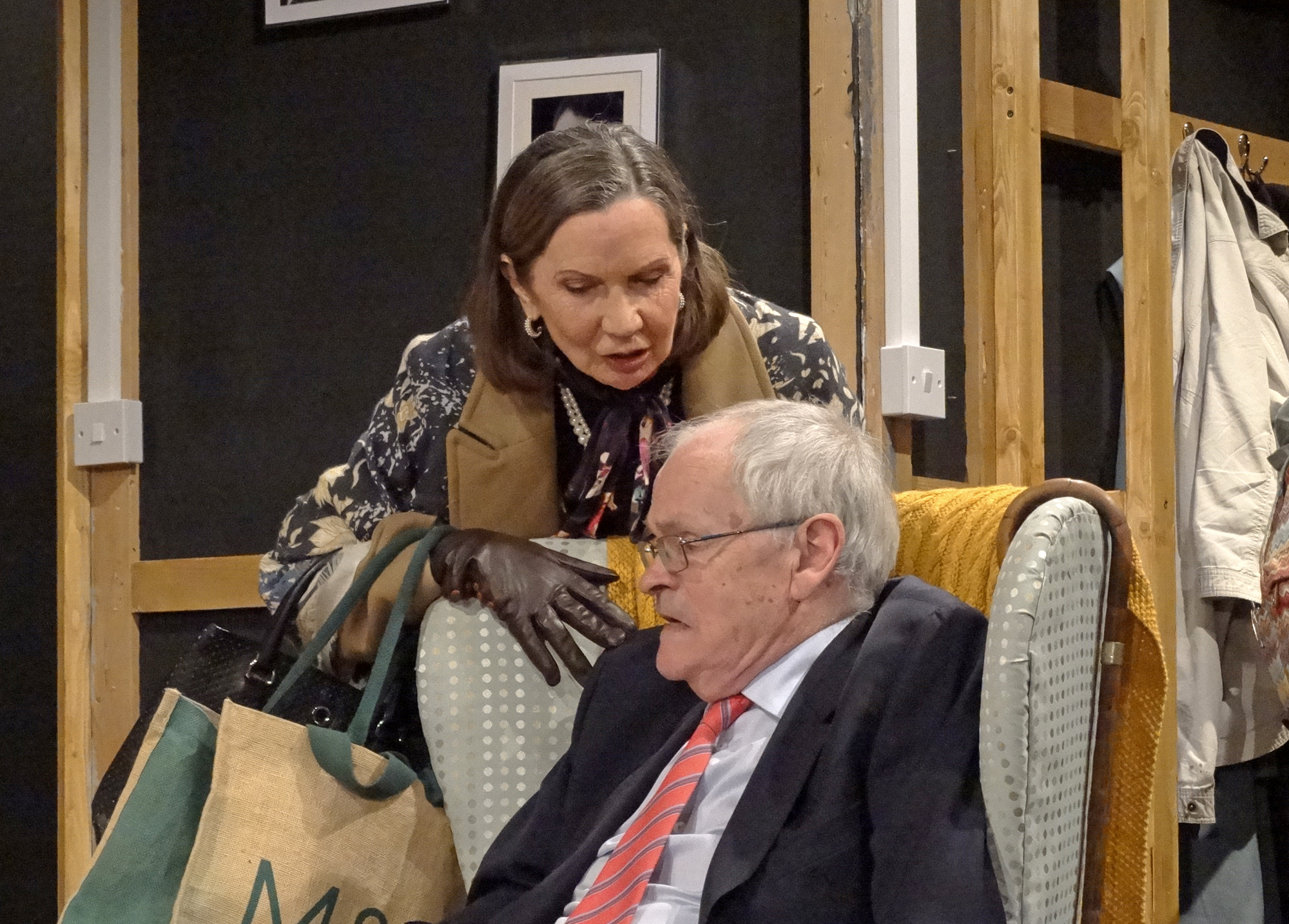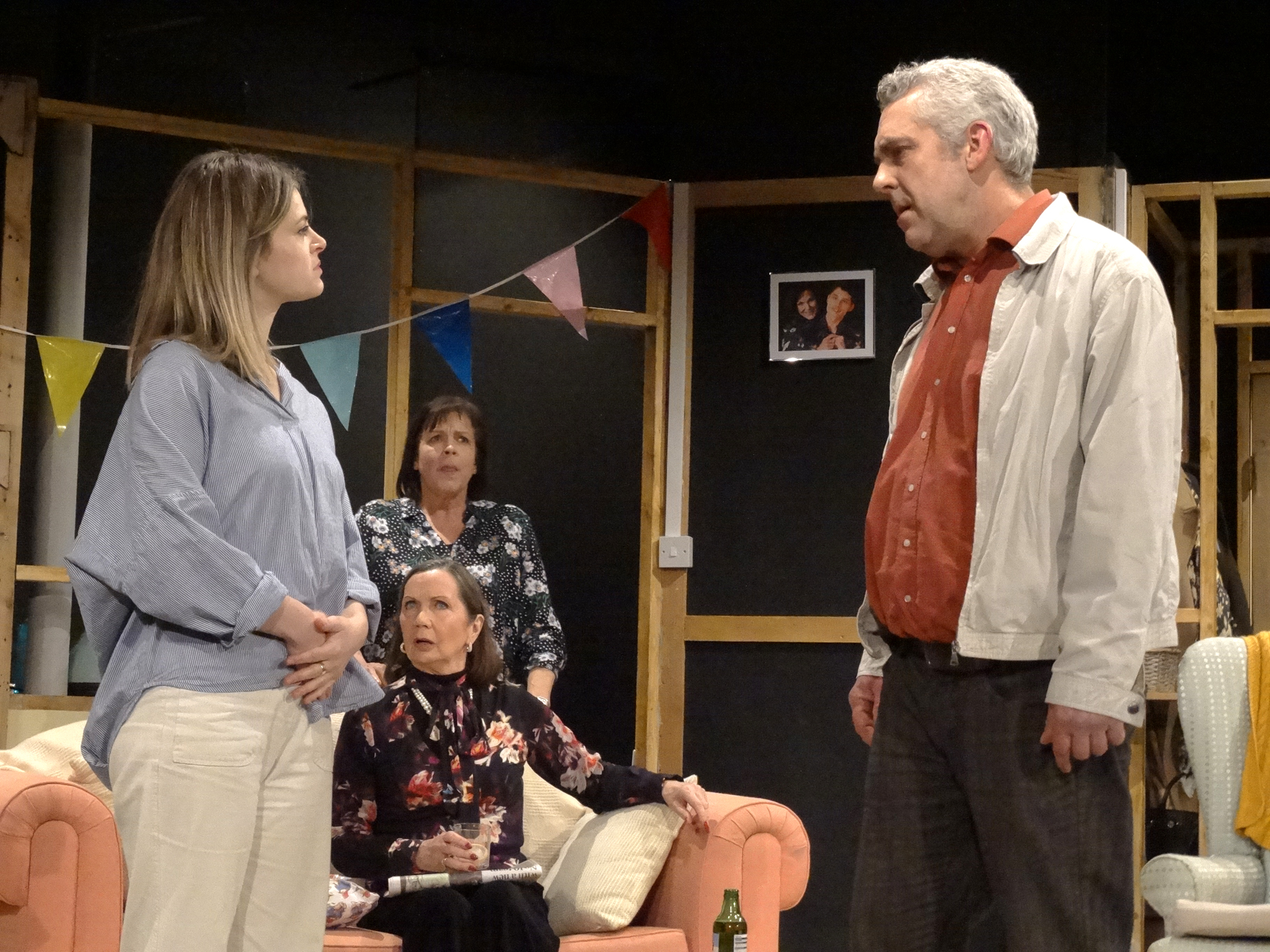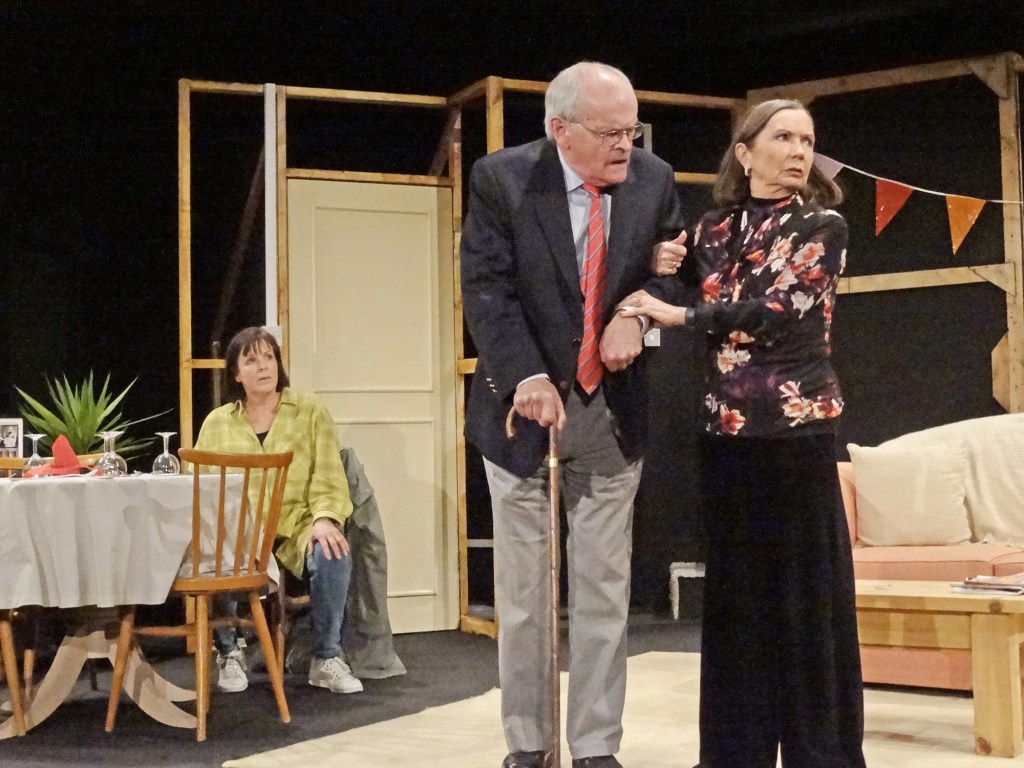 It’s a tale of three couples, three generations, and the top photo shows five out of the six cast members. Ian, on the right, is divorced from Carol (centre rear) and they are the parents of the disabled Andy (who we never see) and his sister Claire, on the left. She’s just announced that she and her partner are having a baby, and the news is shocking to her parents and to her waspish grandmother Patricia, Carol’s mother.