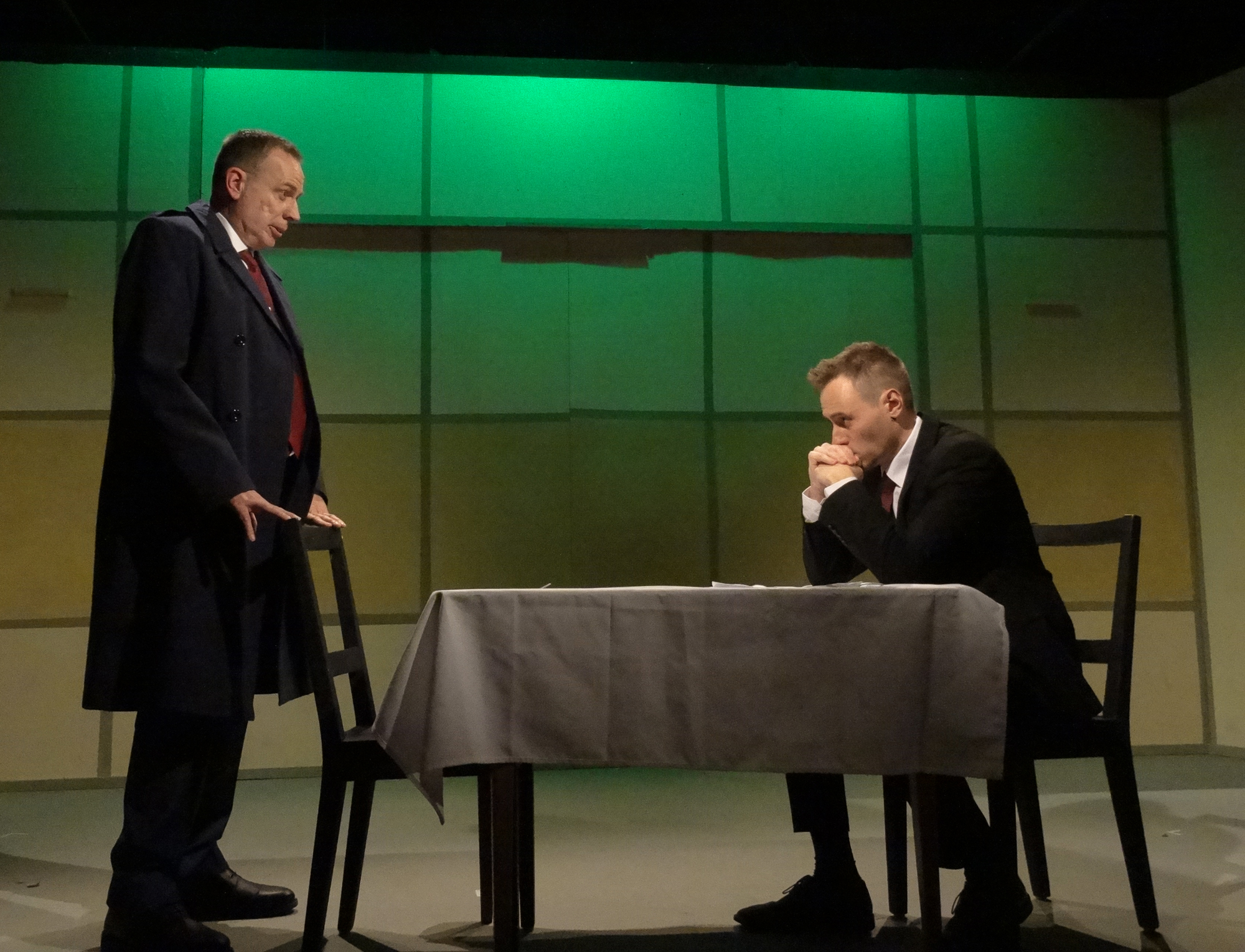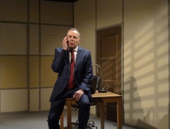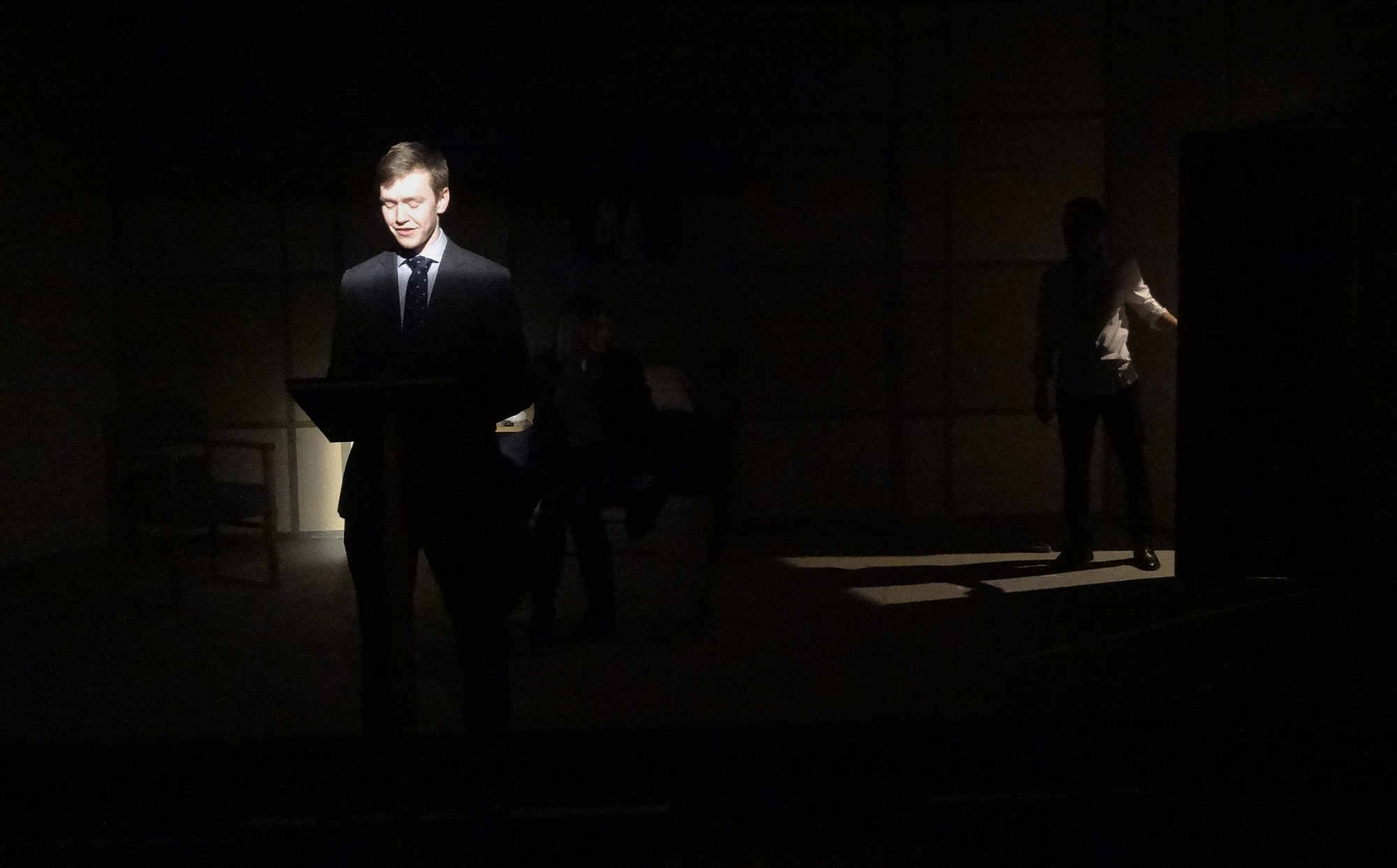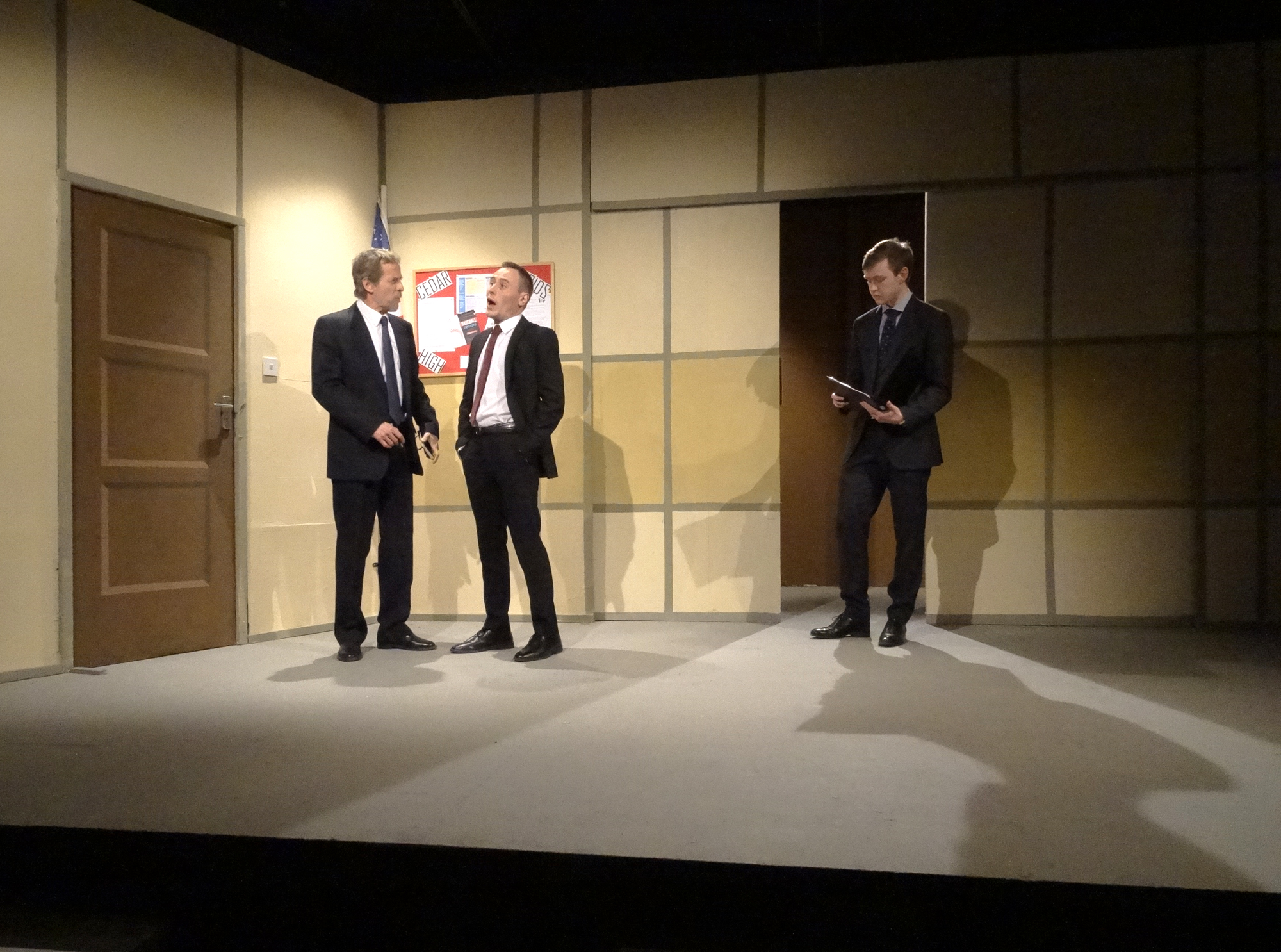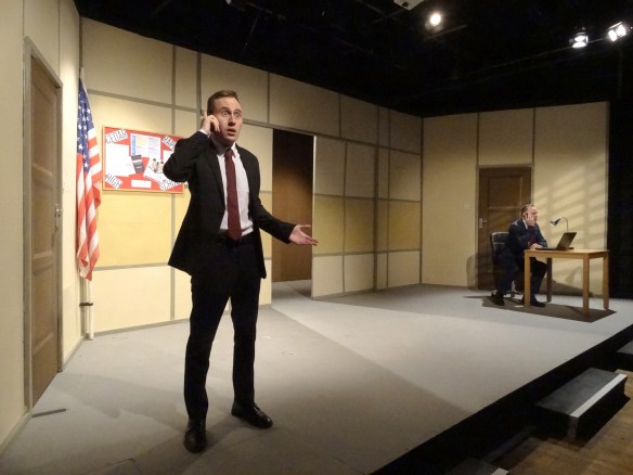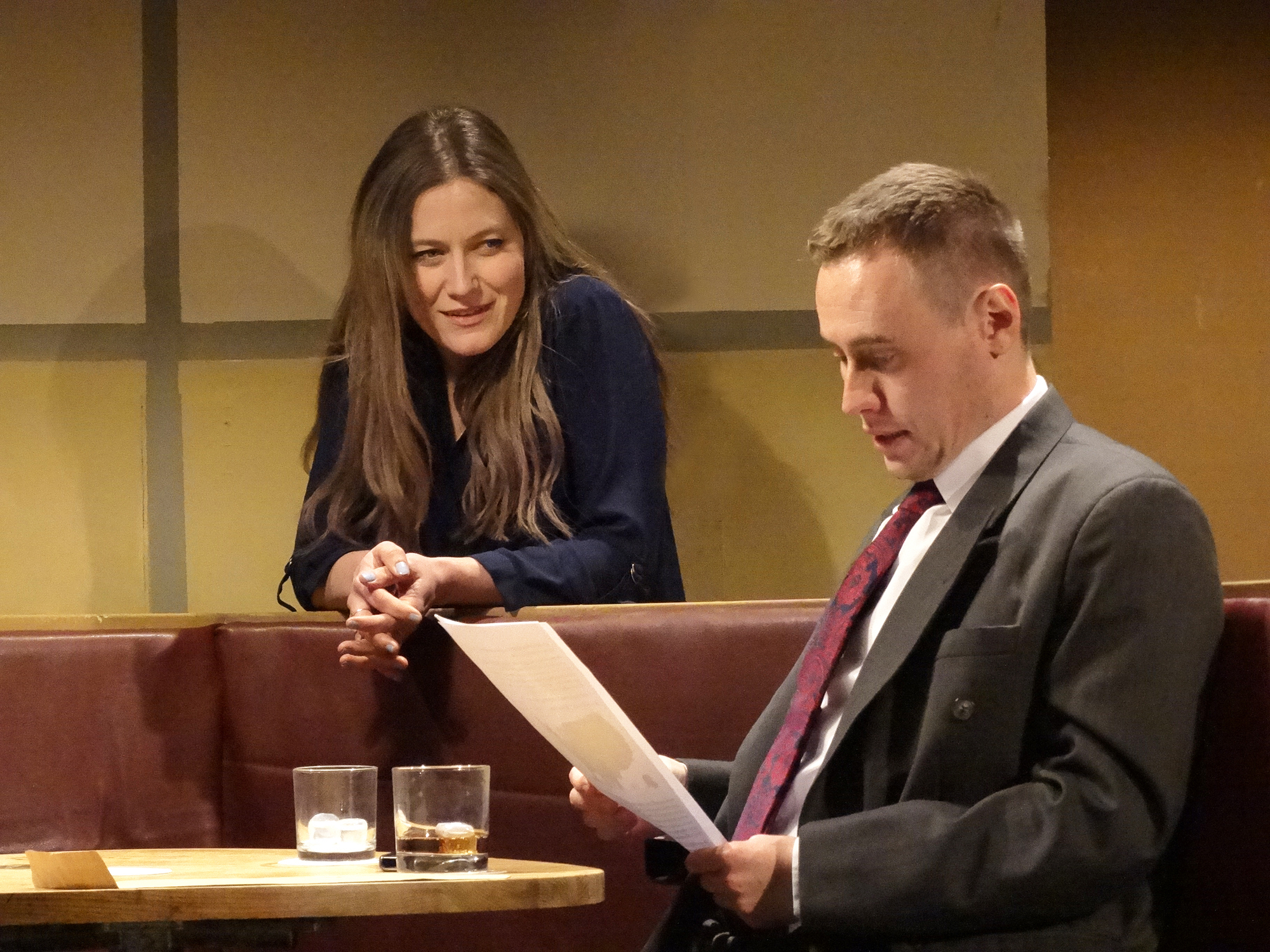 Interesting to light – I was able to illuminate the actors’ faces from a central lamp hanging over the booth table. The Press Secretary soon fell for the charms of the office Intern, Molly.