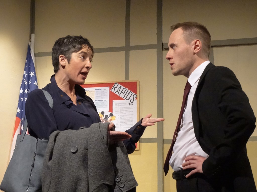 This is the opening scene of ‘Farragut North’, the January production at New Venture Theatre. A huddle of politicians and a journalist in the bar of an Ohio hotel, during a primary election to select the party’s Presidential candidate.