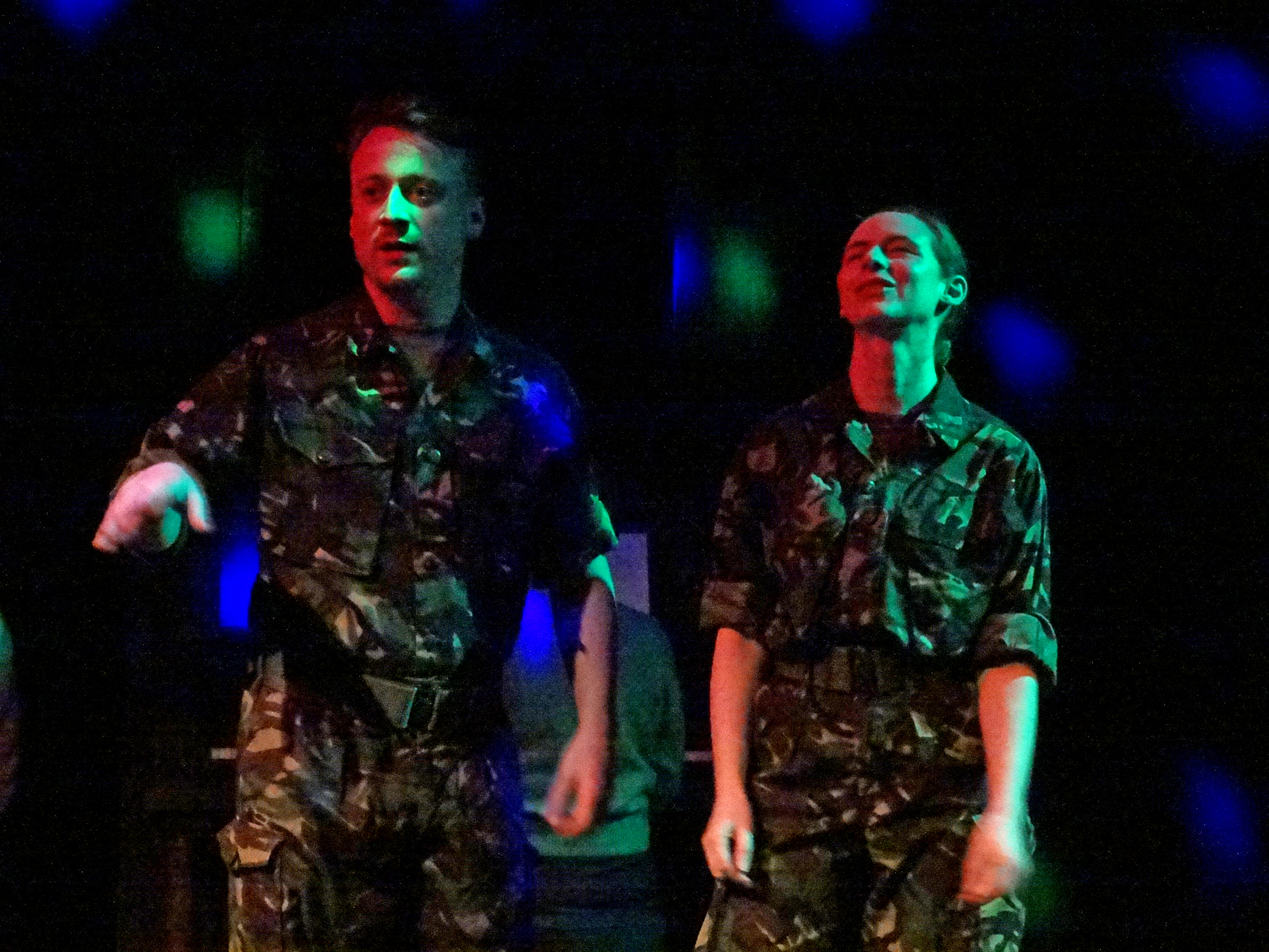 This is the party scene from ‘Not Talking’, the February production at NVT. The young recruits at an army training base get very drunk, and Amanda gets raped – which is a central theme of the play. I used a pair of manually controlled lamps fading up and down to provide the effect, along with a small disco flashing unit.