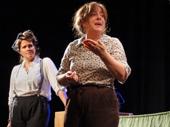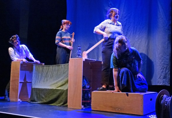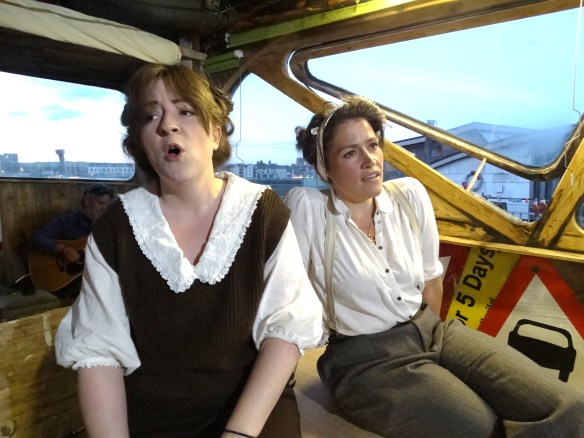 ‘Idle Women’ was a lovely show to work on. Four amazingly talented actors / singers – that’s them, L-R – Emma, Cat, Maple and Lizzie – with Phil in the middle, who did the music and wrote a lot of the songs. Here they are on the houseboat ‘Verda’, on the mudflats at Shoreham, where they first performed this show during the Brighton Festival in the summer of 2023. The props were minimal – a set of boxes that could be rearranged to become the exterior or interior of their canal boat.