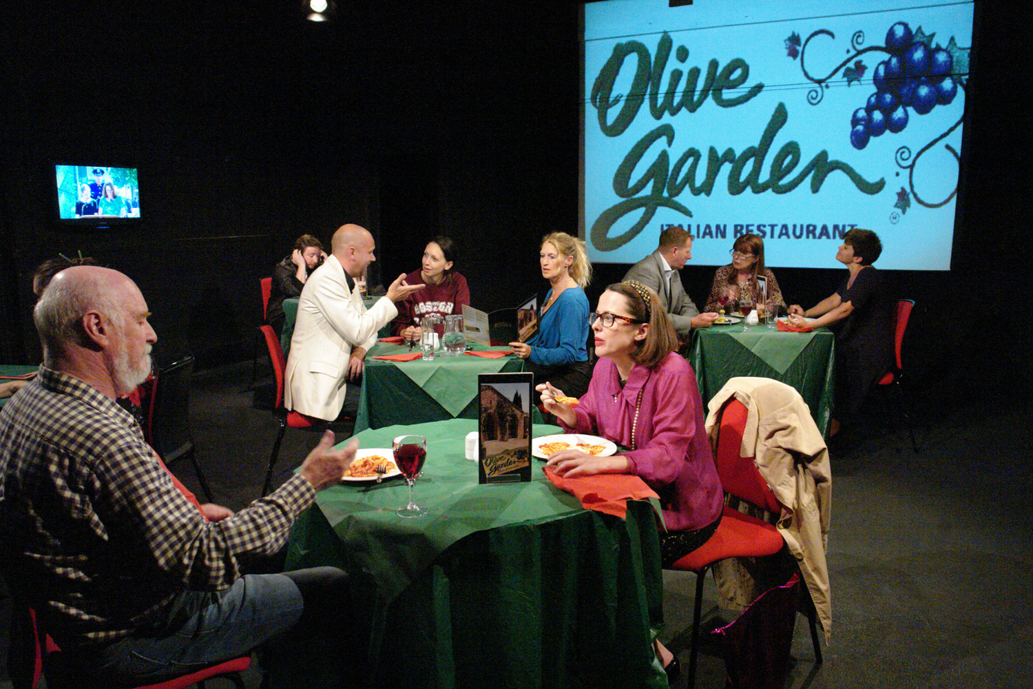 Very much a multi-media production, with the locations defined by video projections onto the theatre’s walls. The plays’ settings varied from an