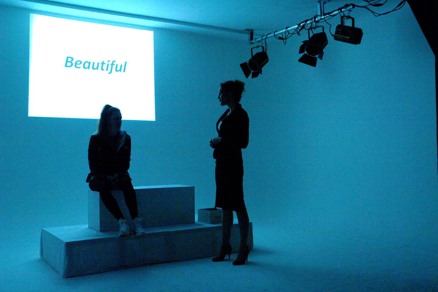 Director Sandie Armstrong wanted to do the play at Brighton Media Centre, which has a photographic studio in the basement, with an ‘infinity cove’ that has curves where the walls and floor meet. This is used to produce horizon-free photography, but for ‘Brewers Fayre’ we used it to create an other-worldly setting for the play. After all – a lot of it takes place in the virtual