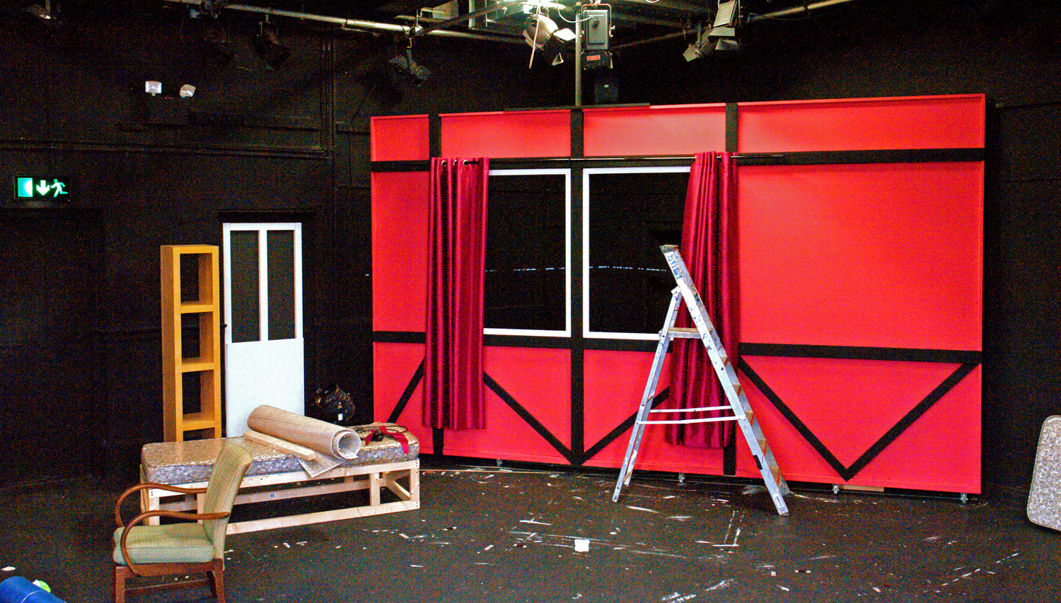 I designed a set consisting of a fixed flat with a door, and two lightweight double-sided flats that could be rotated to present the audience with a variety of combinations – a double bed for the bedroom scenes, for example, or a cooker (and the other flat set at an angle) to give us the kitchen scenes.