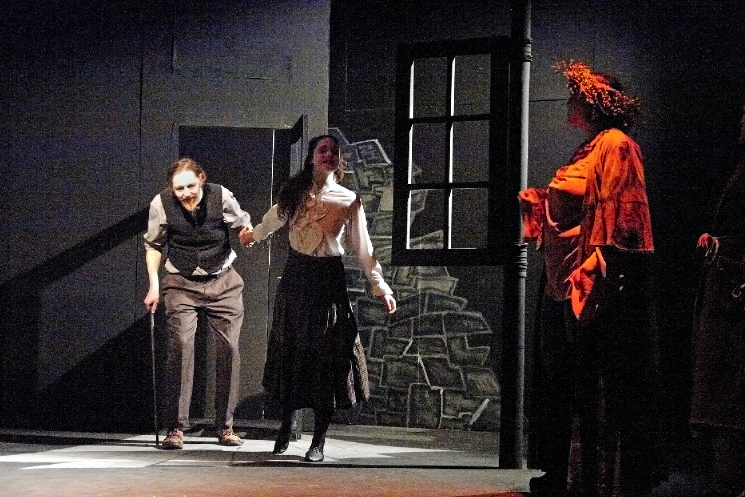 As part of the set, I made use of the column in the centre of the NVT upstairs stage to hang a window, which could be rotated by pushing it round as an actor looked through it. So we saw Scrooge’s back as he peered out through the panes, then as it was turned we saw him from the outside, with the scene he was looking at occupying the downstage area.