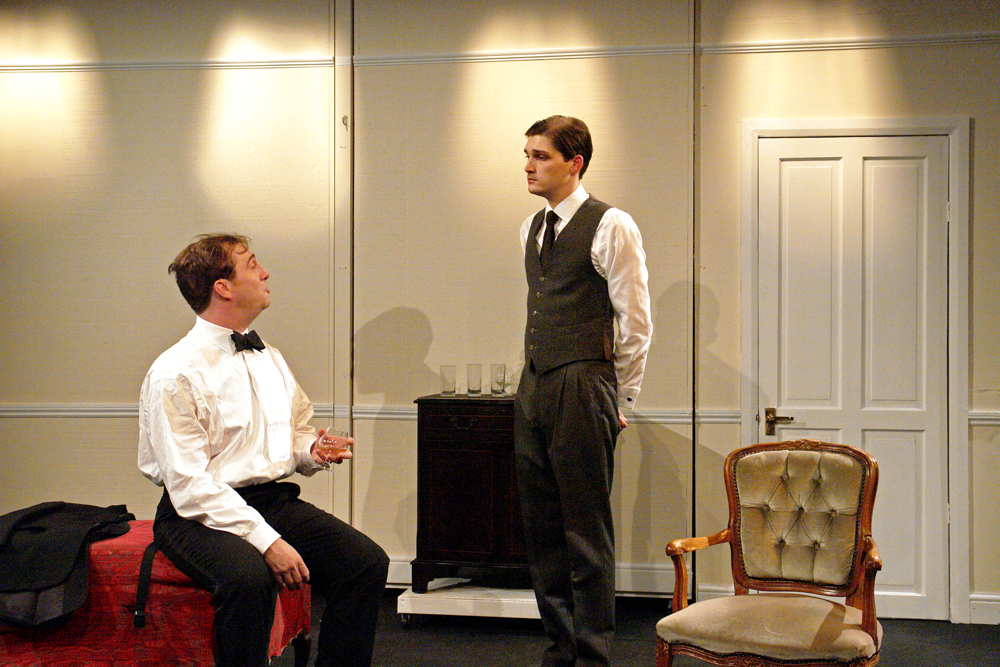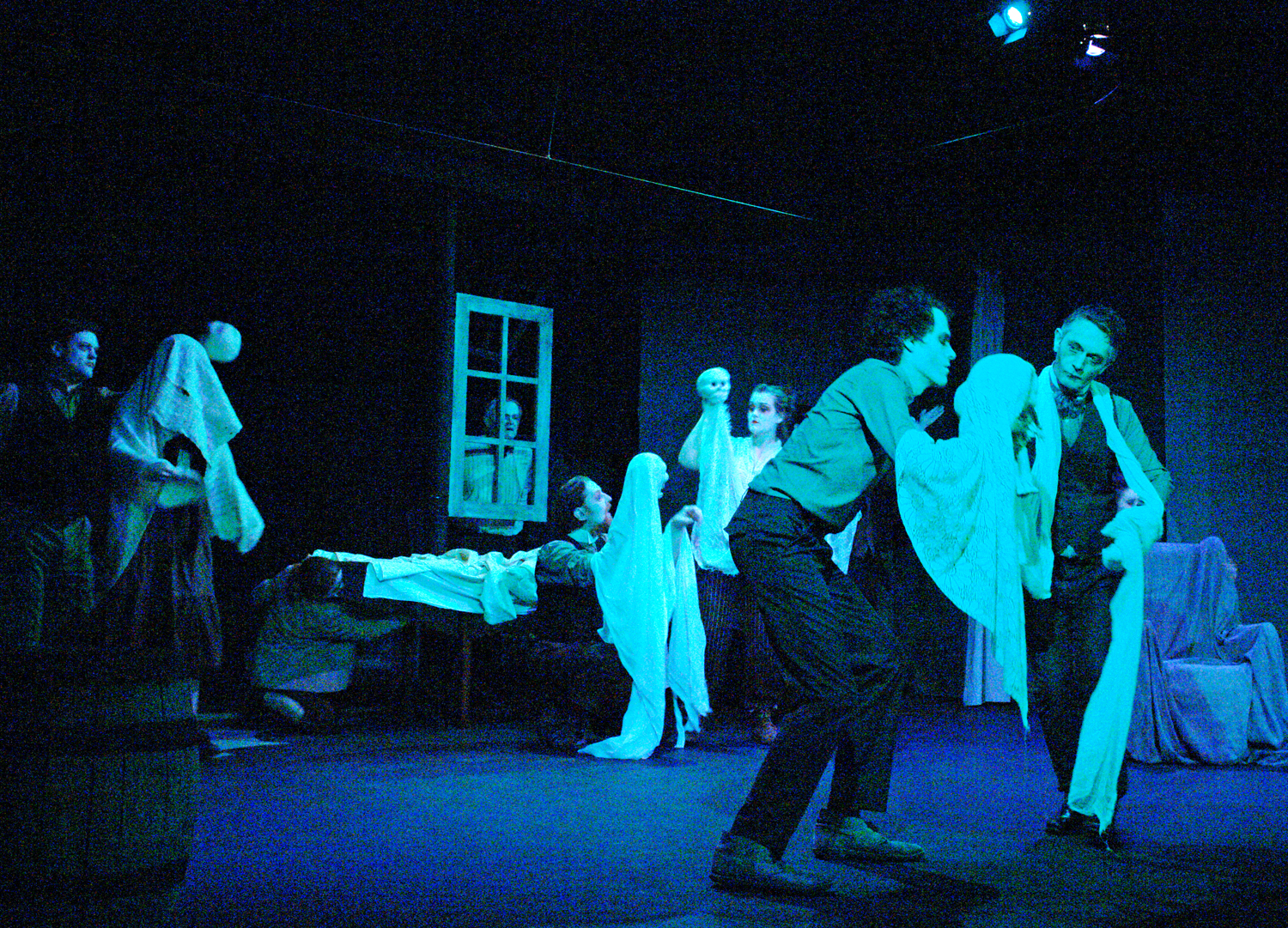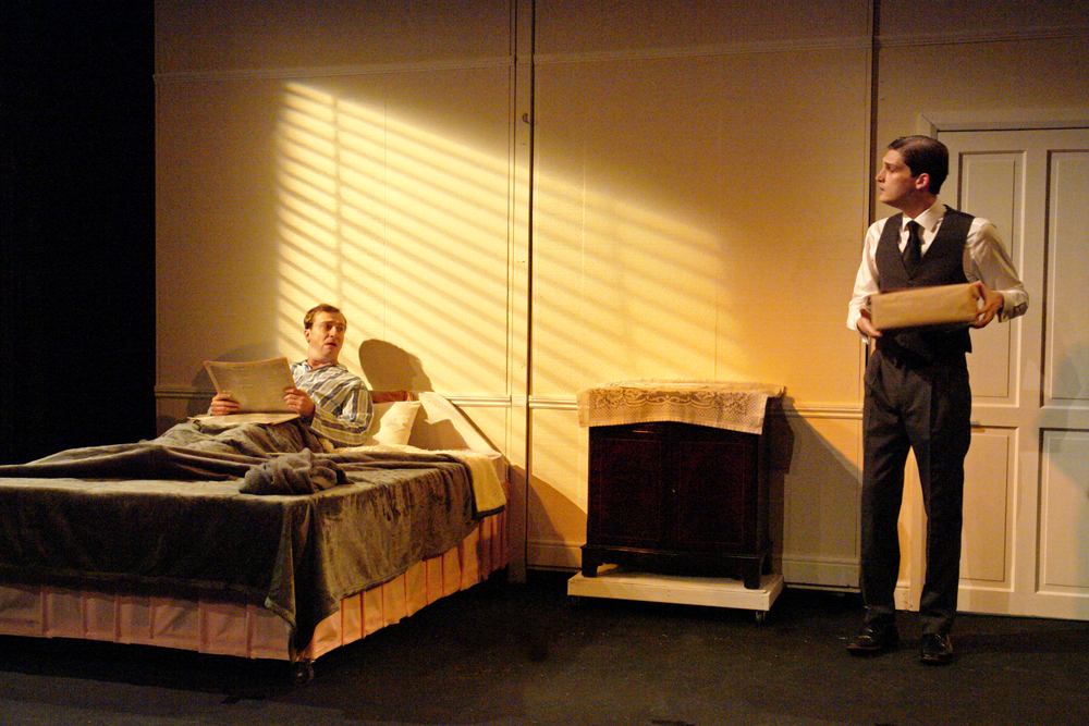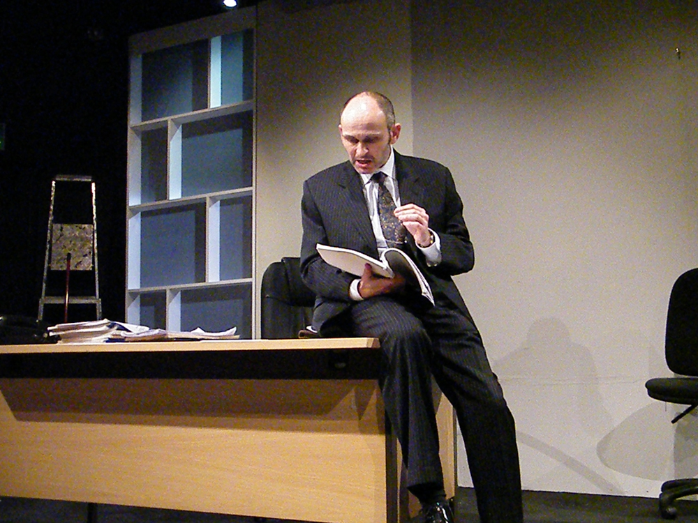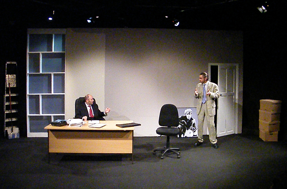 The script tells that his new office is being redecorated, so we put a patch of unfinished paint on the wall, and the stage crew were dressed in painters’ white overalls for the transition. I like to think that we turned a necessary scene change into a piece of theatre in its own right.