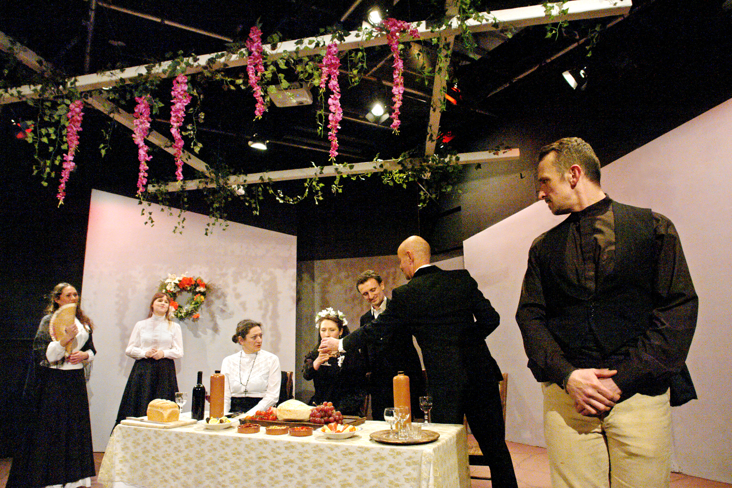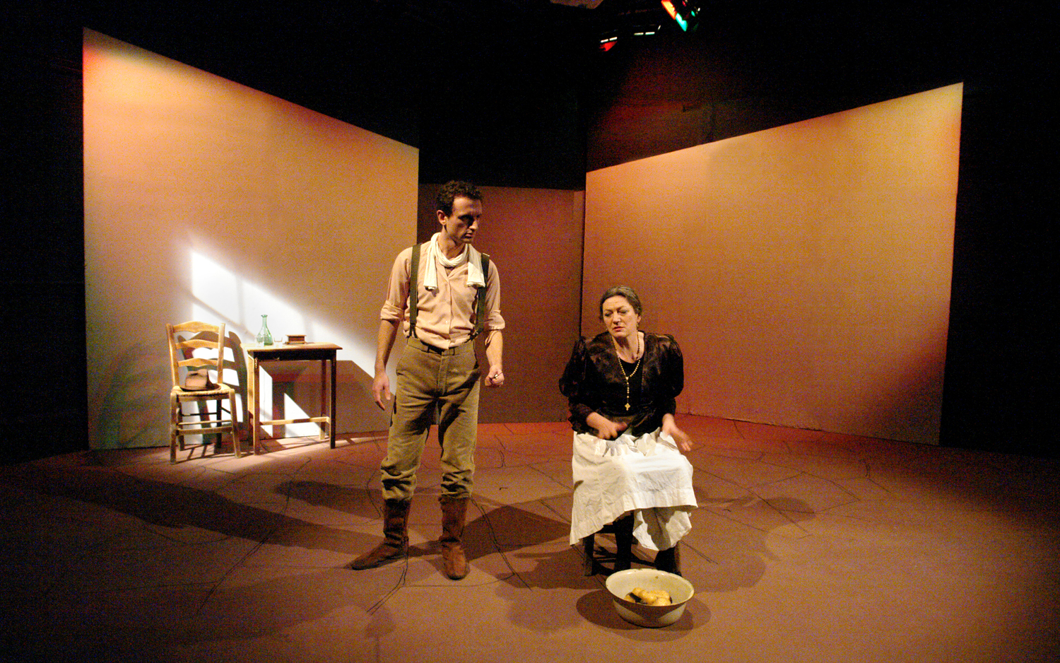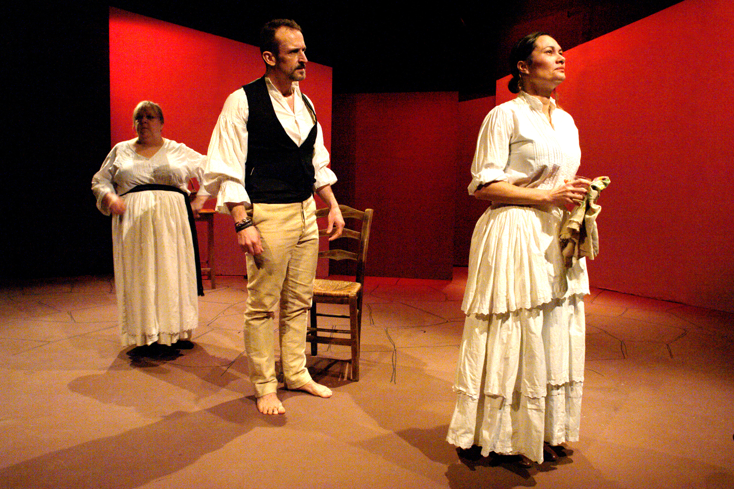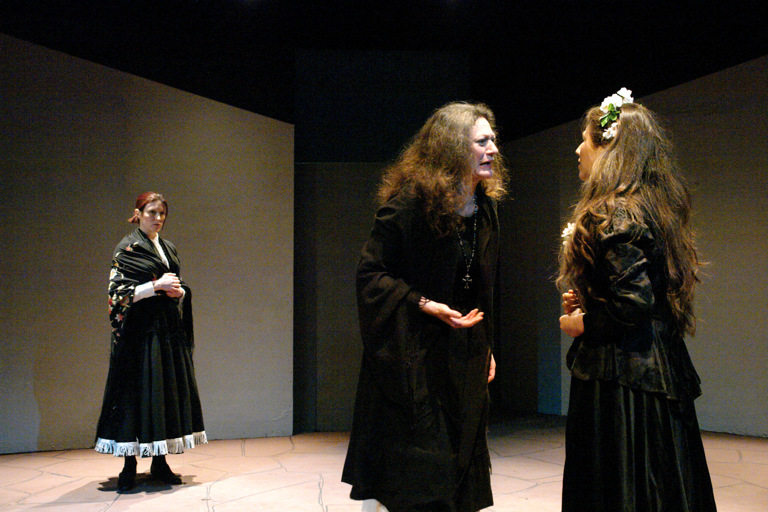 Federico Garcia Lorca’s play is about the drive to acquire and control land in the rural Spain of the 1930’s. A young woman has to marry a landowner’s son she doesn’t really love, to link two families’ estates – but at the wedding she runs off with her former admirer, for whom she feels real passion. Two families’ honour is outraged, and the couple are pursued into the forest. The action takes place in a number of different places, so my concept for the set was to have a very simple and stark arrangement of flats, painted off-white, which could be lit with different colours to suggest different locations.