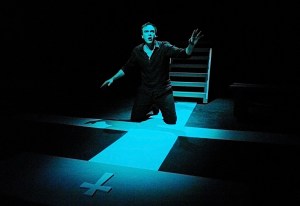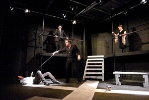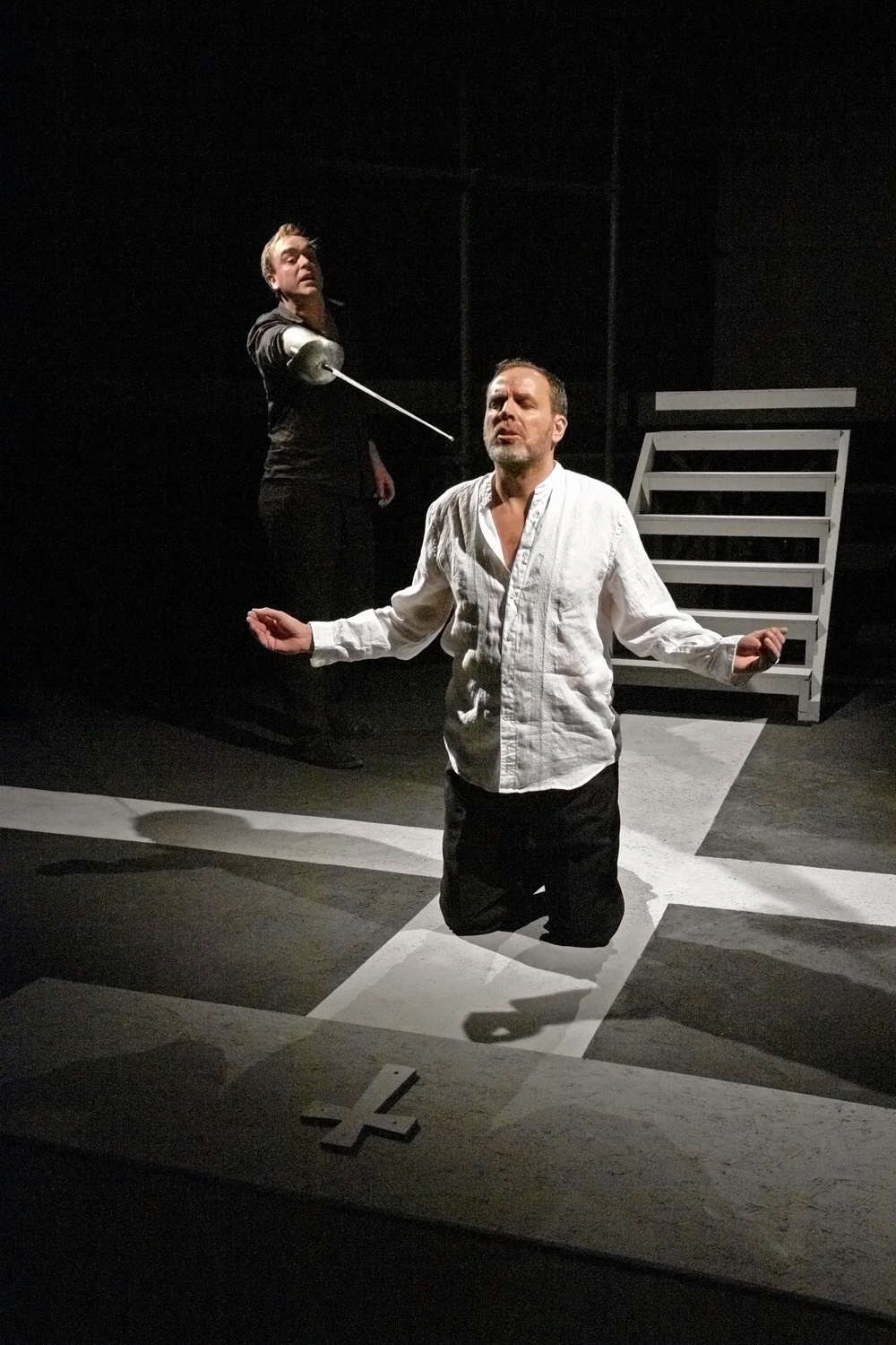We built a gantry, overlooking a central floor area defined by a painted cross leading to the tomb of Hamlet’s murdered father. We’ve used that well-built flight of steps in quite a few subsequent productions