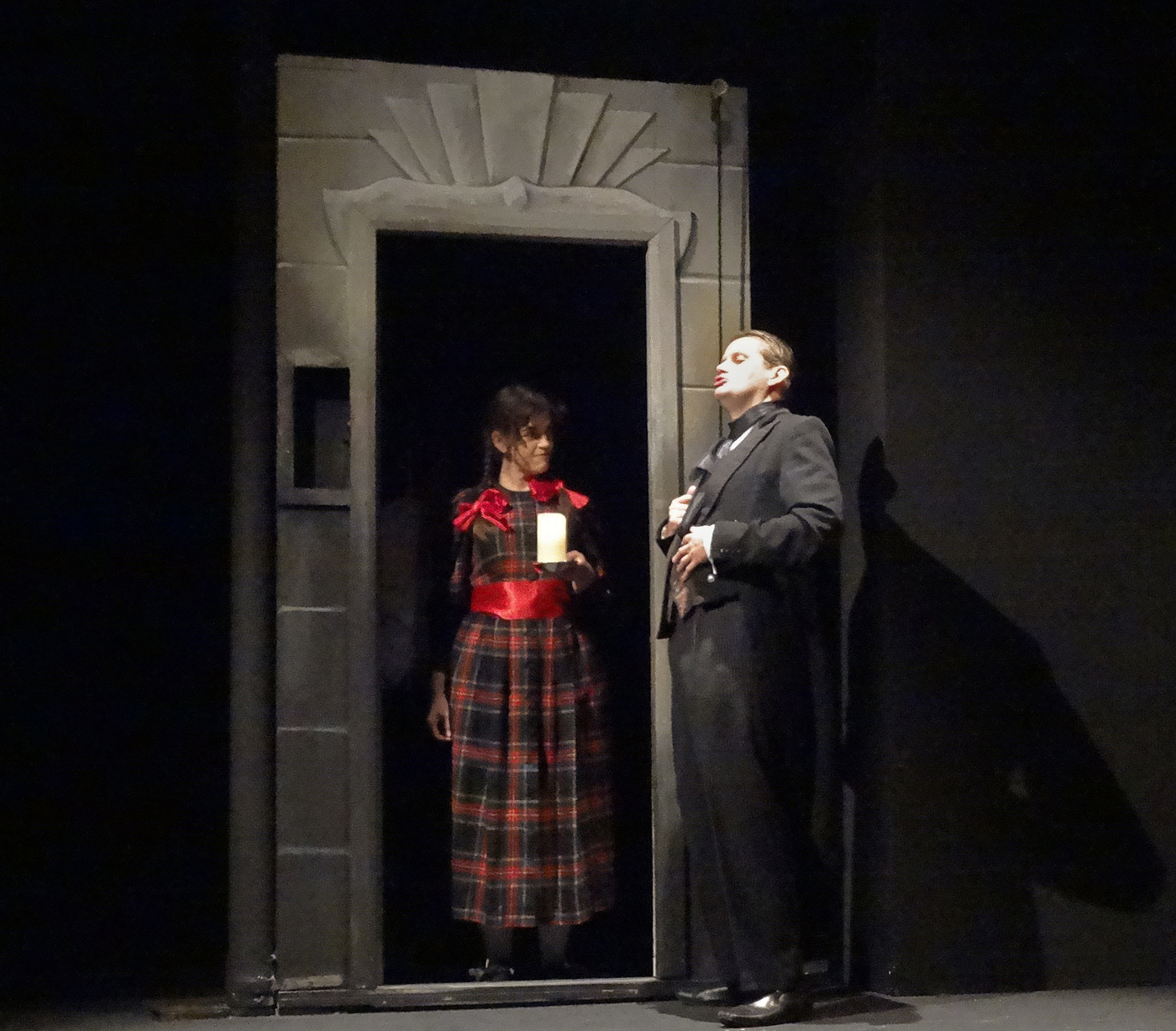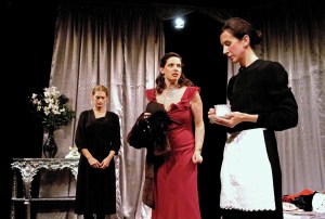 Two flats, draped in silvery velvet material, gave a sense of luxury, and the gap between them served as the room’s window. Here, by moonlight, the sisters fantasize about being their mistress, for they envy her, and also plot to kill her with a cup of poisoned tea (seen in the foreground ).