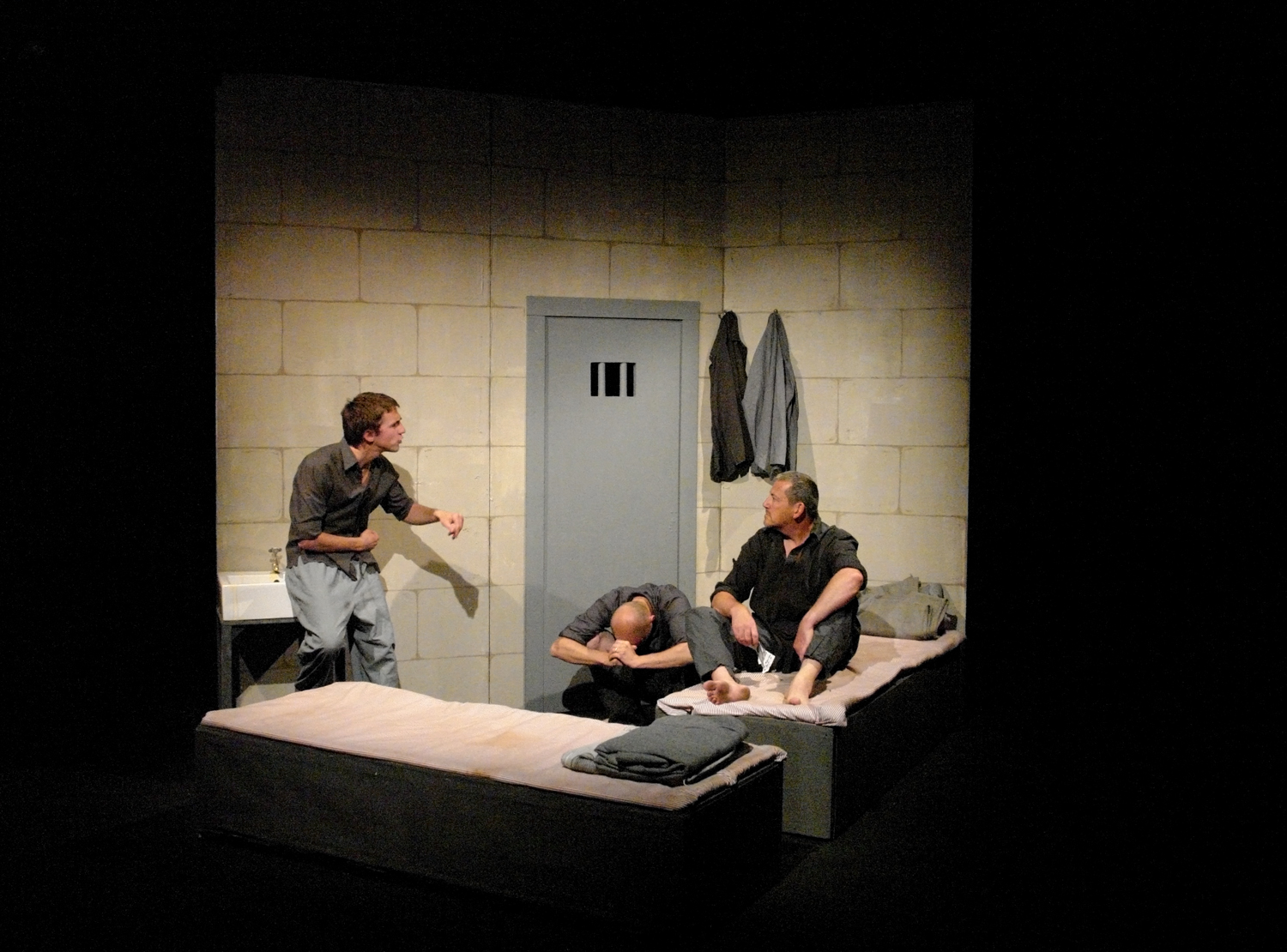 During the interval, a hinged panel was swung round to fill the gap between the flats. As the second play started the prison Guard pulled down the drapes, revealing the prison walls beneath. The centre panel had become the cell door. He pulled the velvet cover off the huge bed to show the two hard prison beds below.