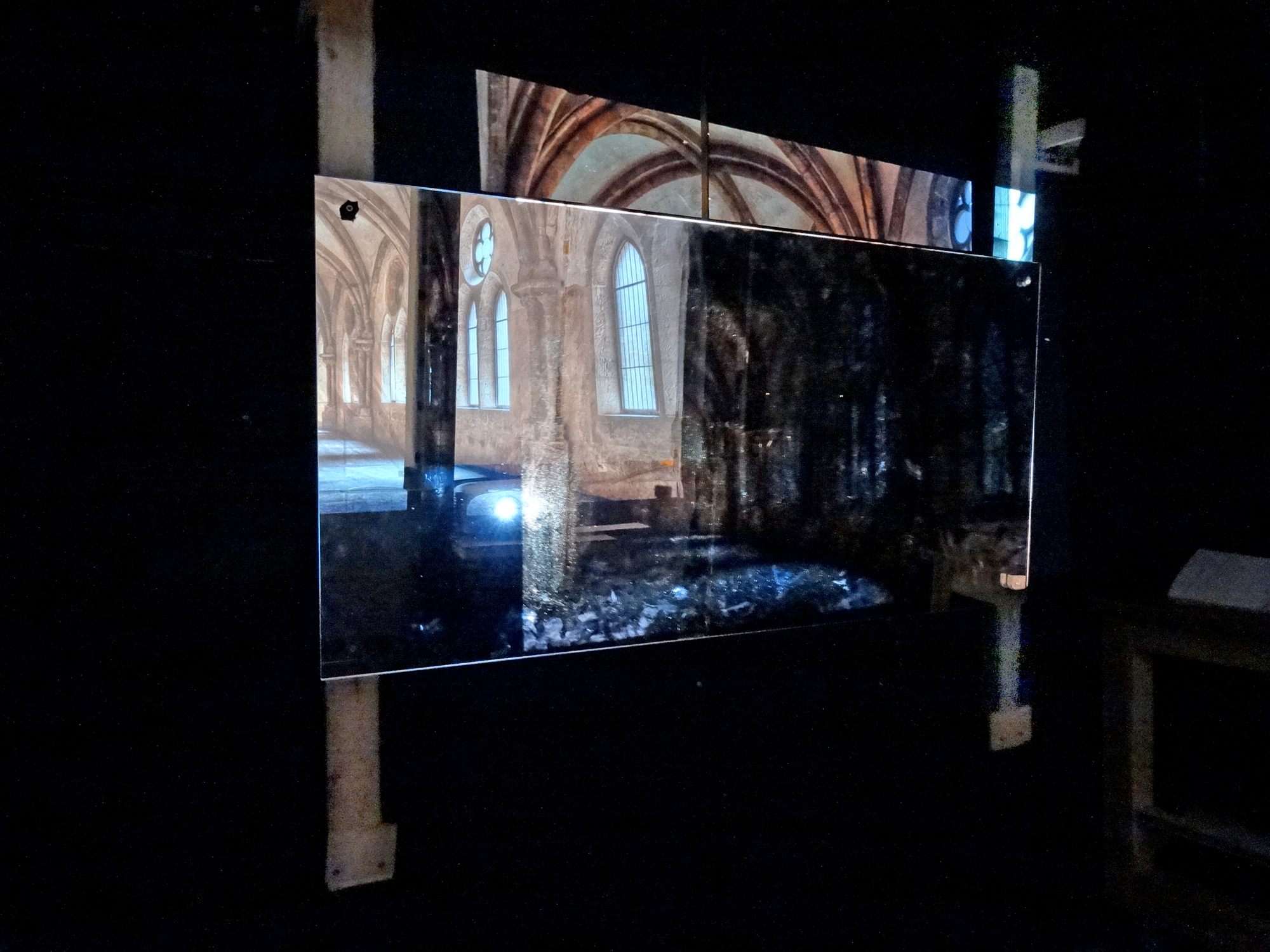 The stage didn’t provide enough space to project a big enough image on the window, so we bounced the image off a large mirror, thus doubling the projector throw length.